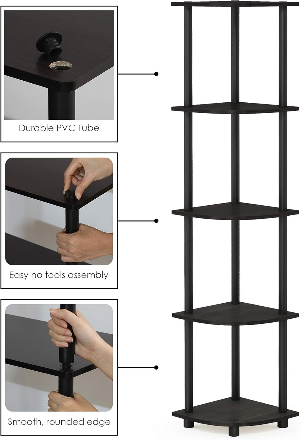 Maximize your space with the Furinno Turn-N-Tube 5 Tier Corner Display Rack, designed to fit perfectly in any corner of your home or office. Its compact dimensions and elegant espresso/black finish make it ideal for small spaces while adding a modern touch to your décor. Crafted from durable engineered wood and sturdy PVC tubes, this shelving unit supports up to 15 lbs per shelf. The innovative Turn-N-Tube system allows for quick, tool-free assembly in minutes. Perfect for displaying books, décor, plants, or kitchen essentials, this versatile rack combines style and functionality for any room.